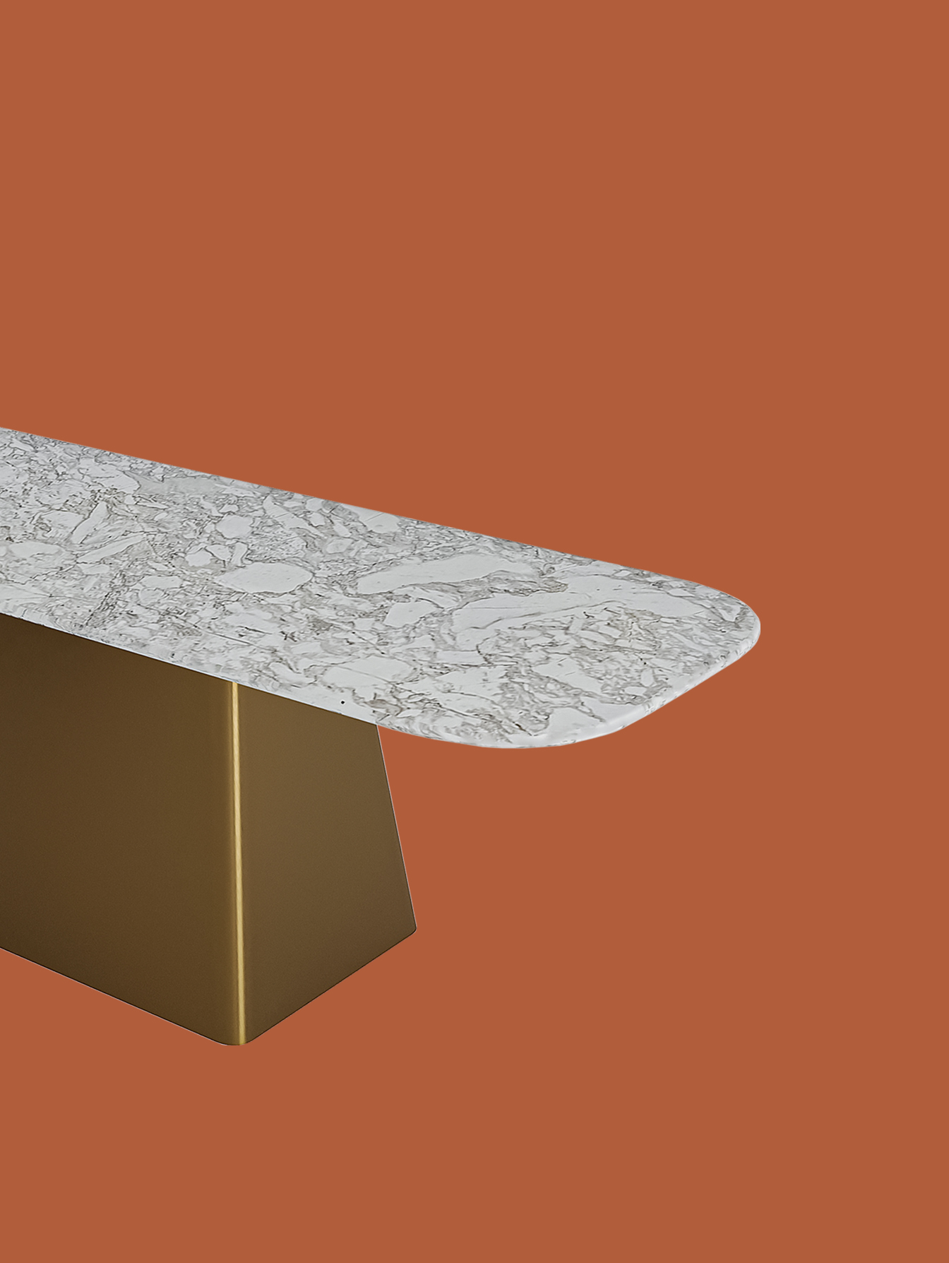 Sculptural and confident, CAPRI stands out with its bold geometric stainless steel base—designed to catch the eye from every angle. Its custom stone top adds a natural counterbalance to the architectural form.