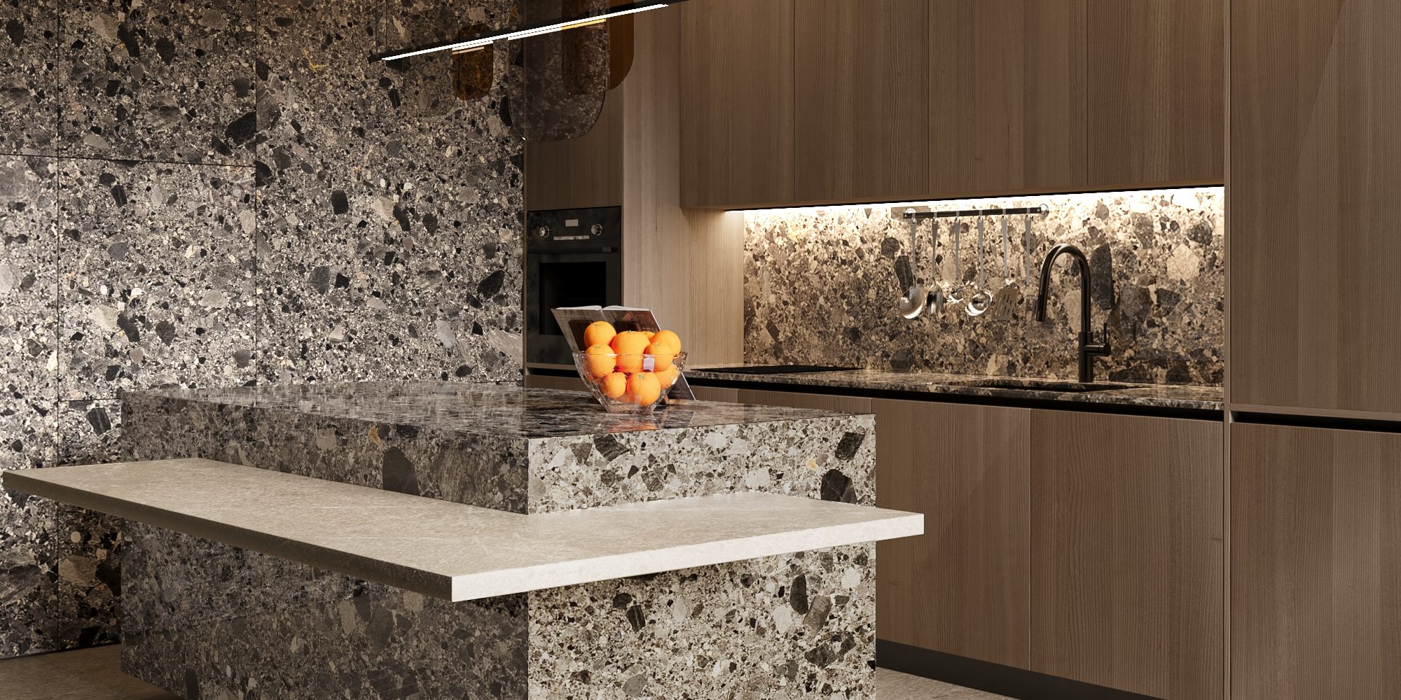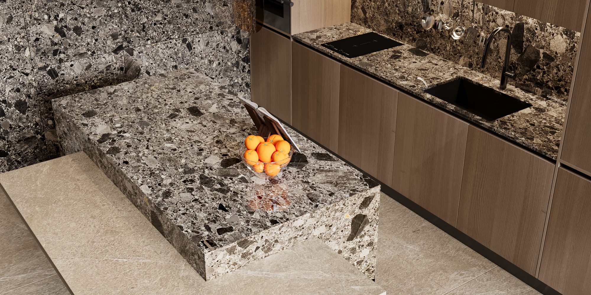 With its distinctive pebble-like pattern and cool grey tones, Ceppo Grey exudes a visual richness that many associate with terrazzo—yet it is entirely natural.