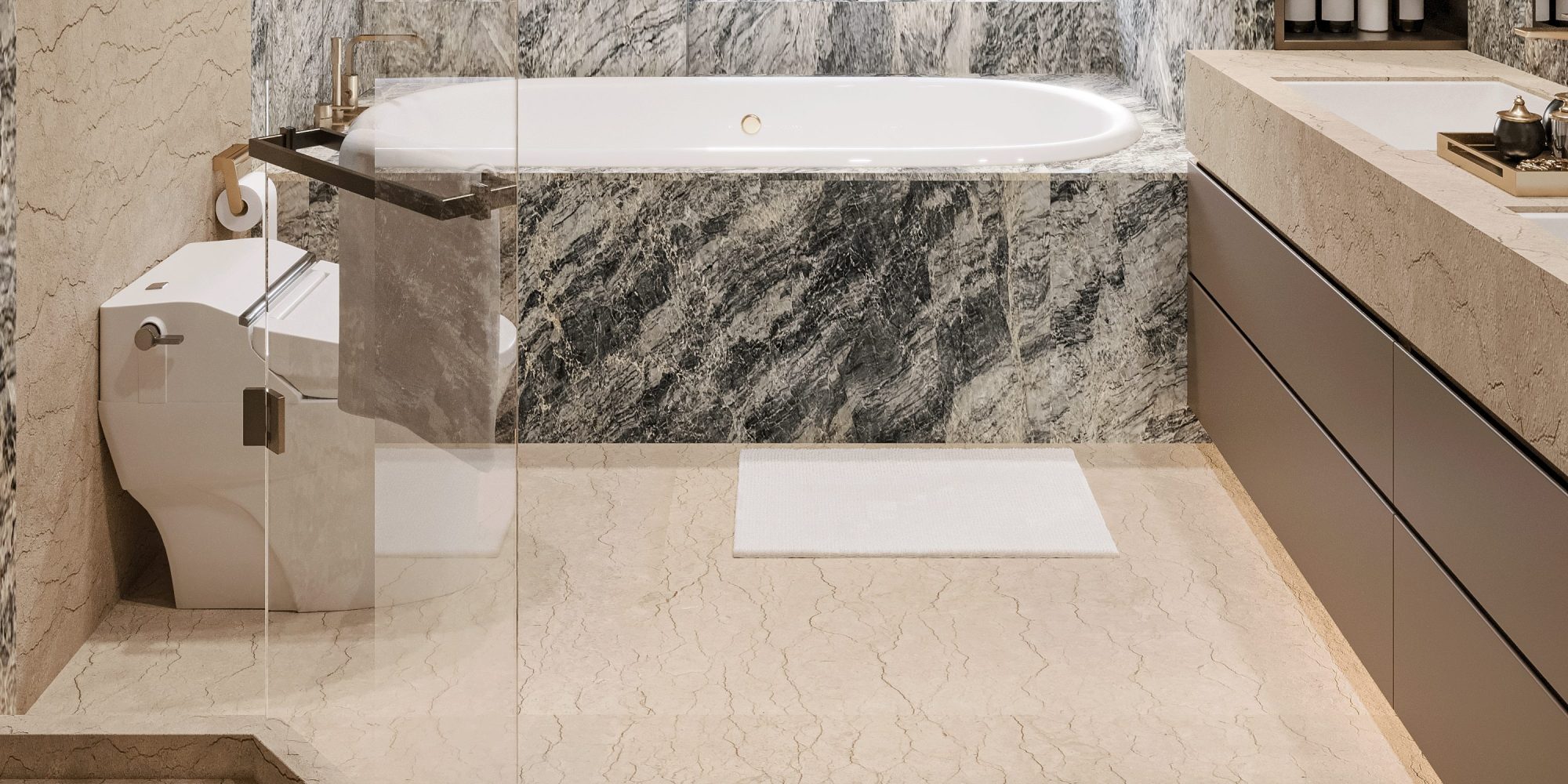 Let Crema Riveria transport you to a peaceful riverbank with its rich ivory tones and delicate, flowing veins that mimic the gentle movement of water.