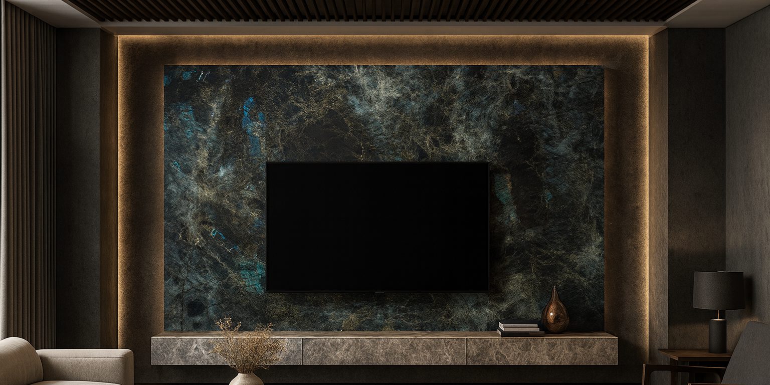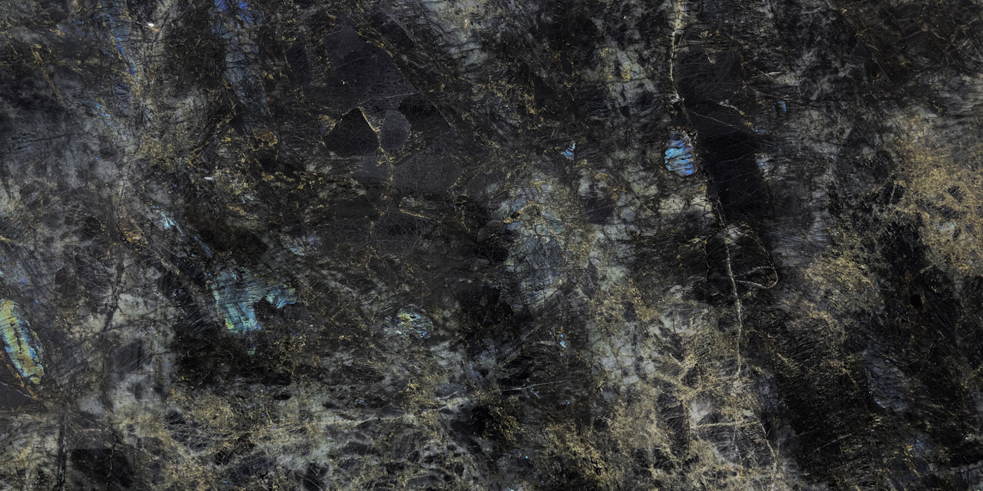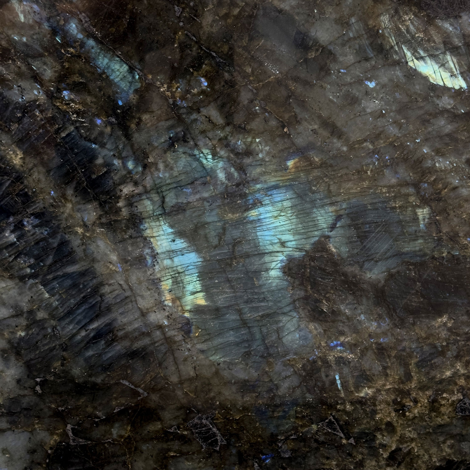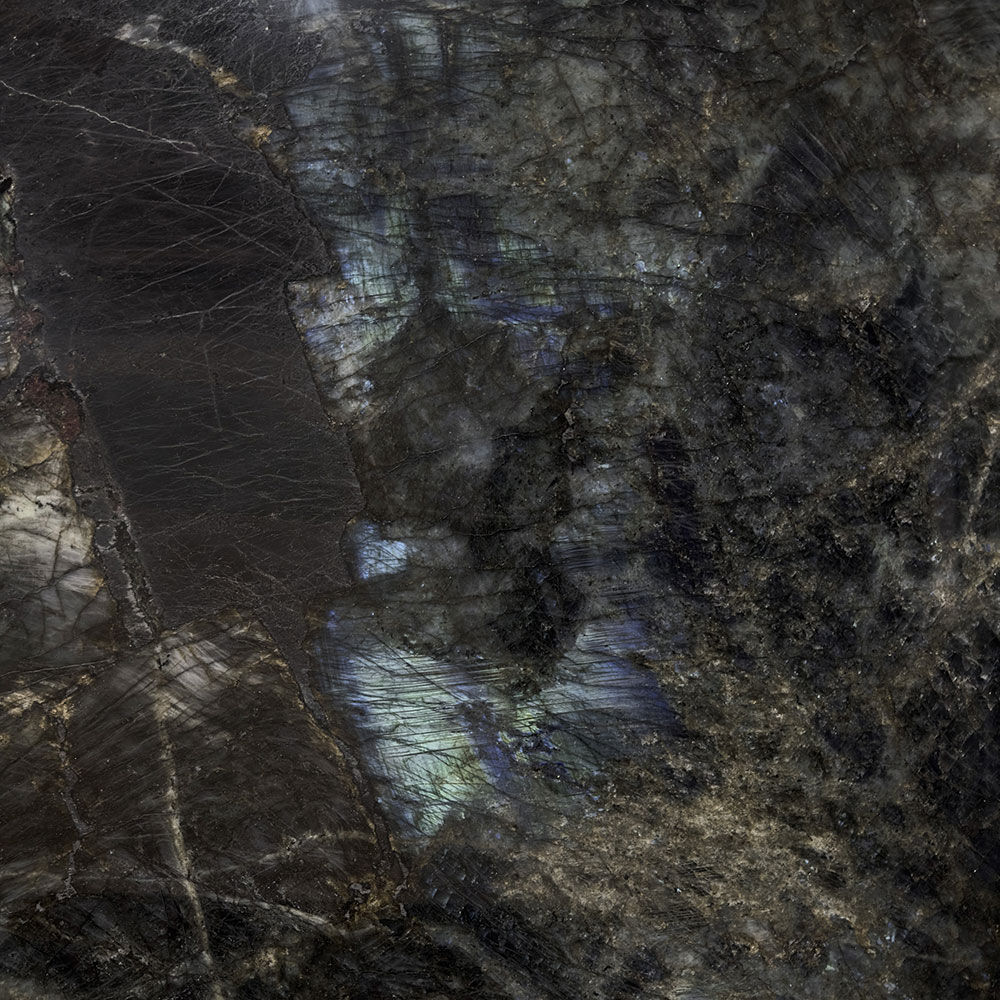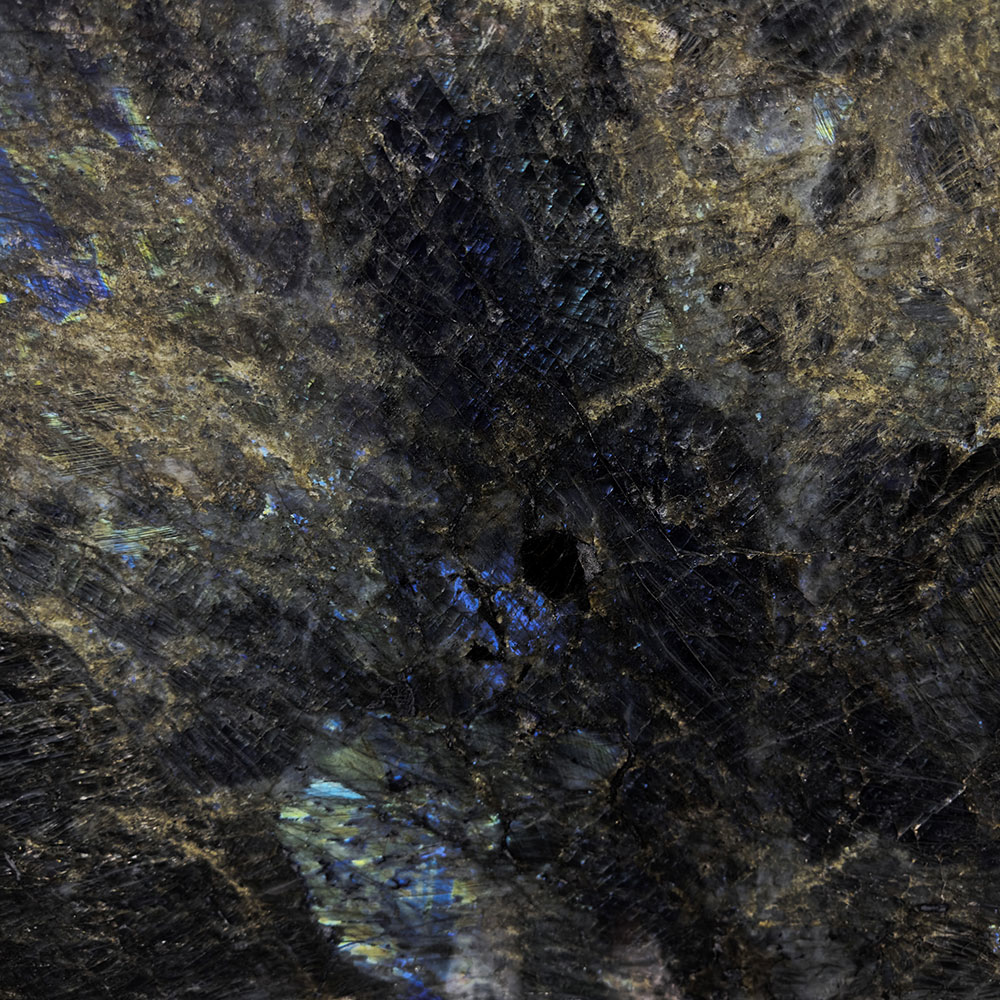 Lemurian Blue features a deep black background, highlighted by vibrant emerald green hues and the iridescence of labradorite. This iridescence creates a dynamic play of light and color, reminiscent of the night sky as it transitions from dusk to deep night.
