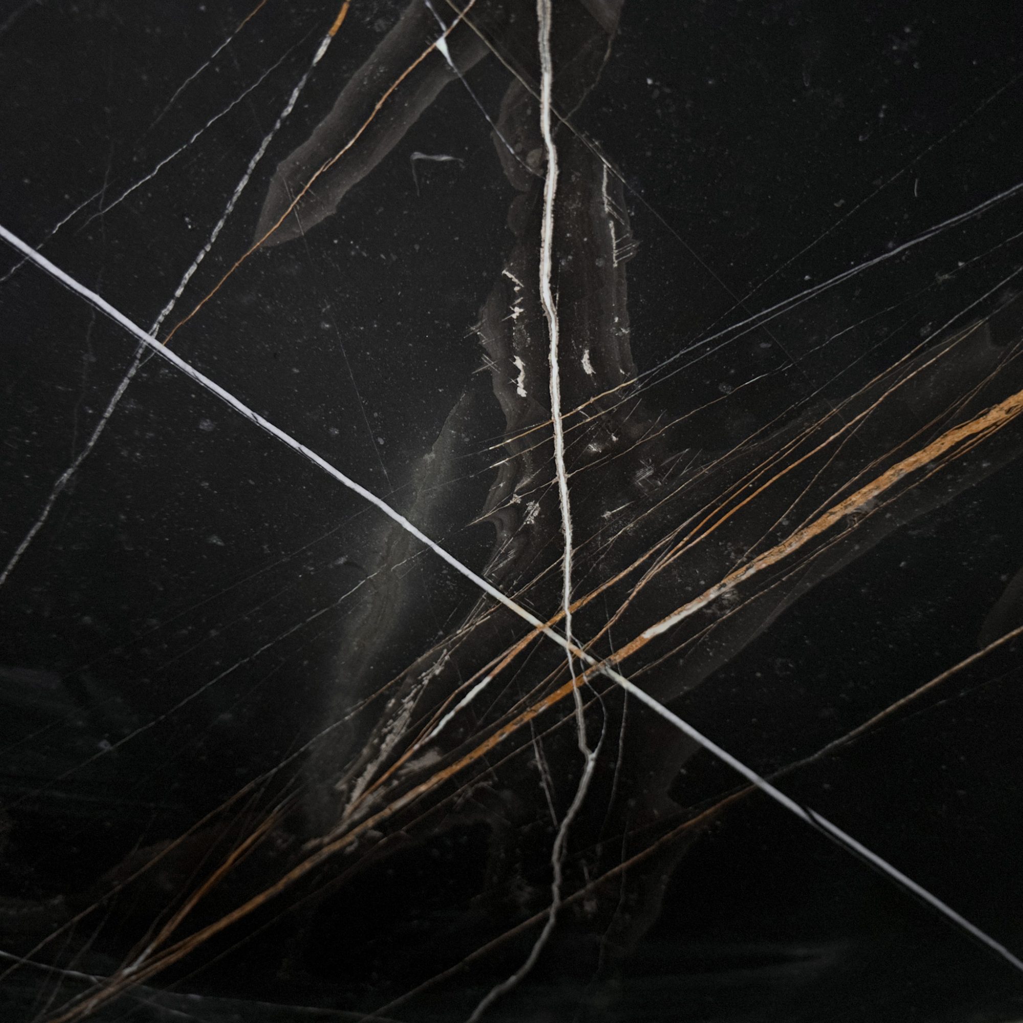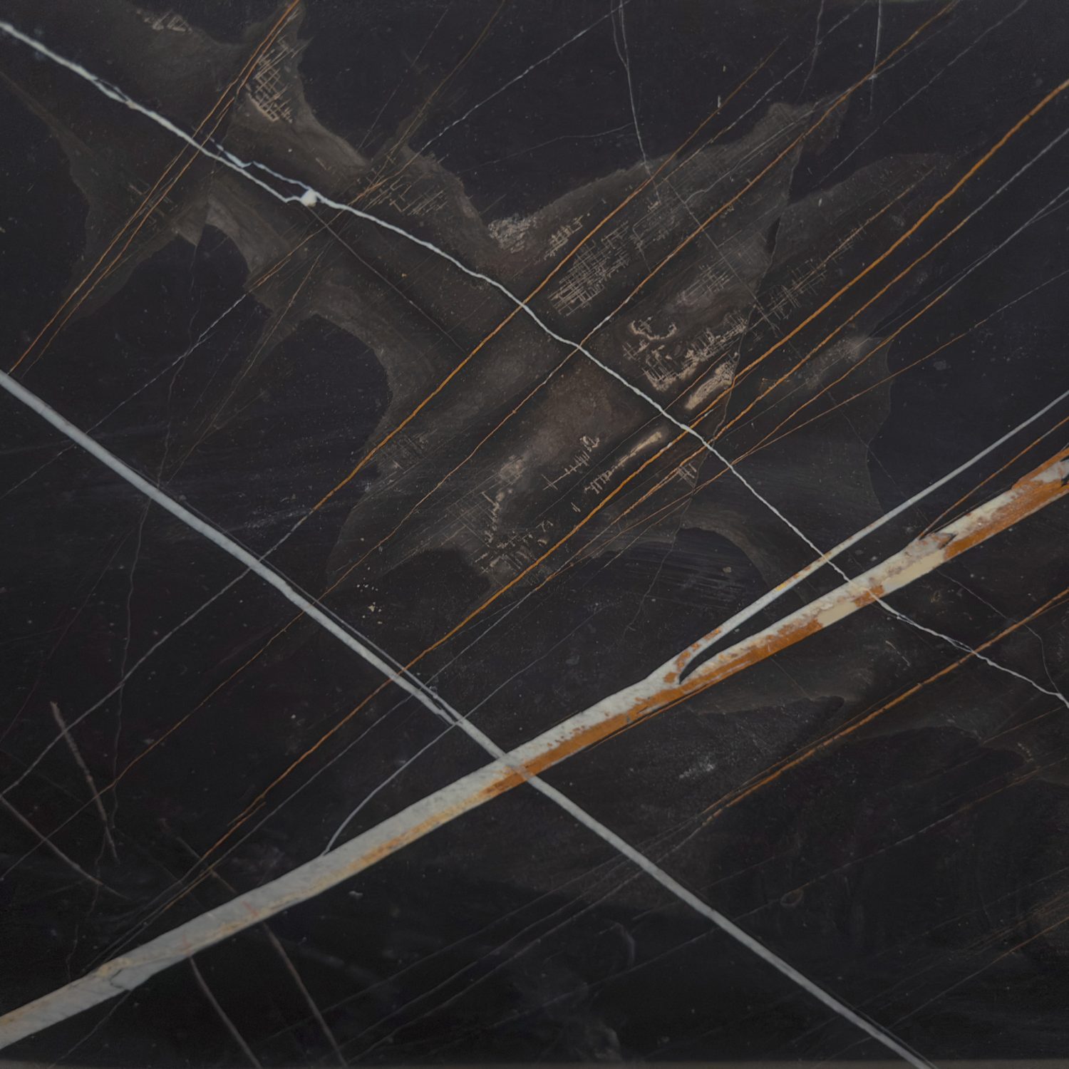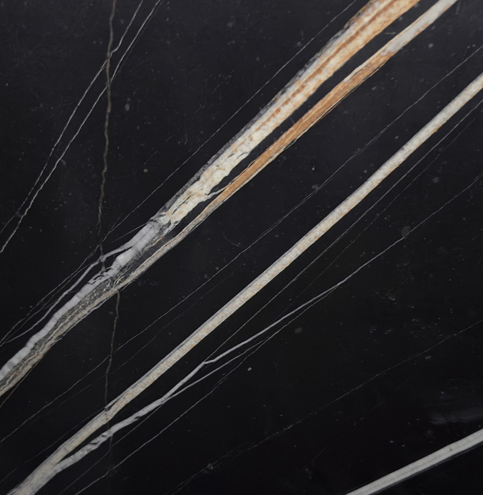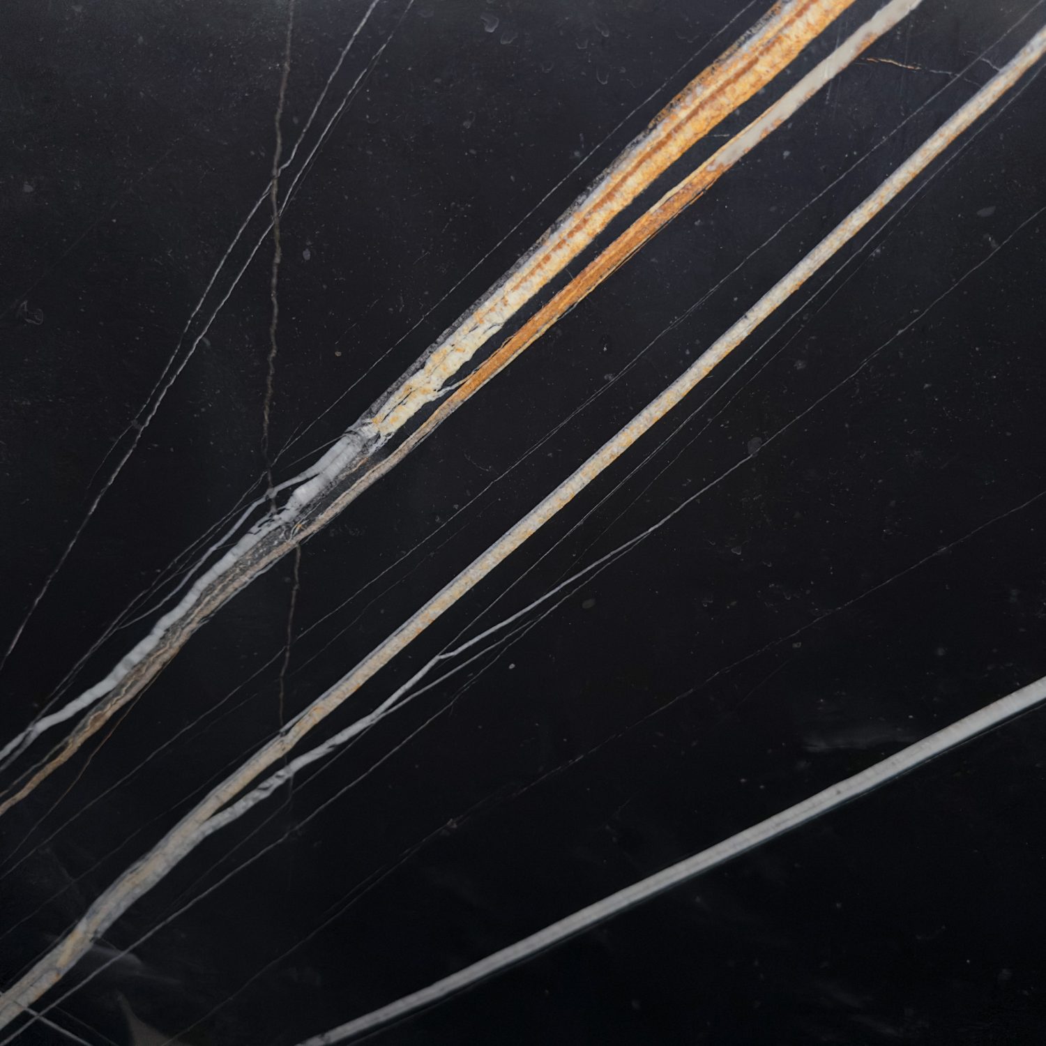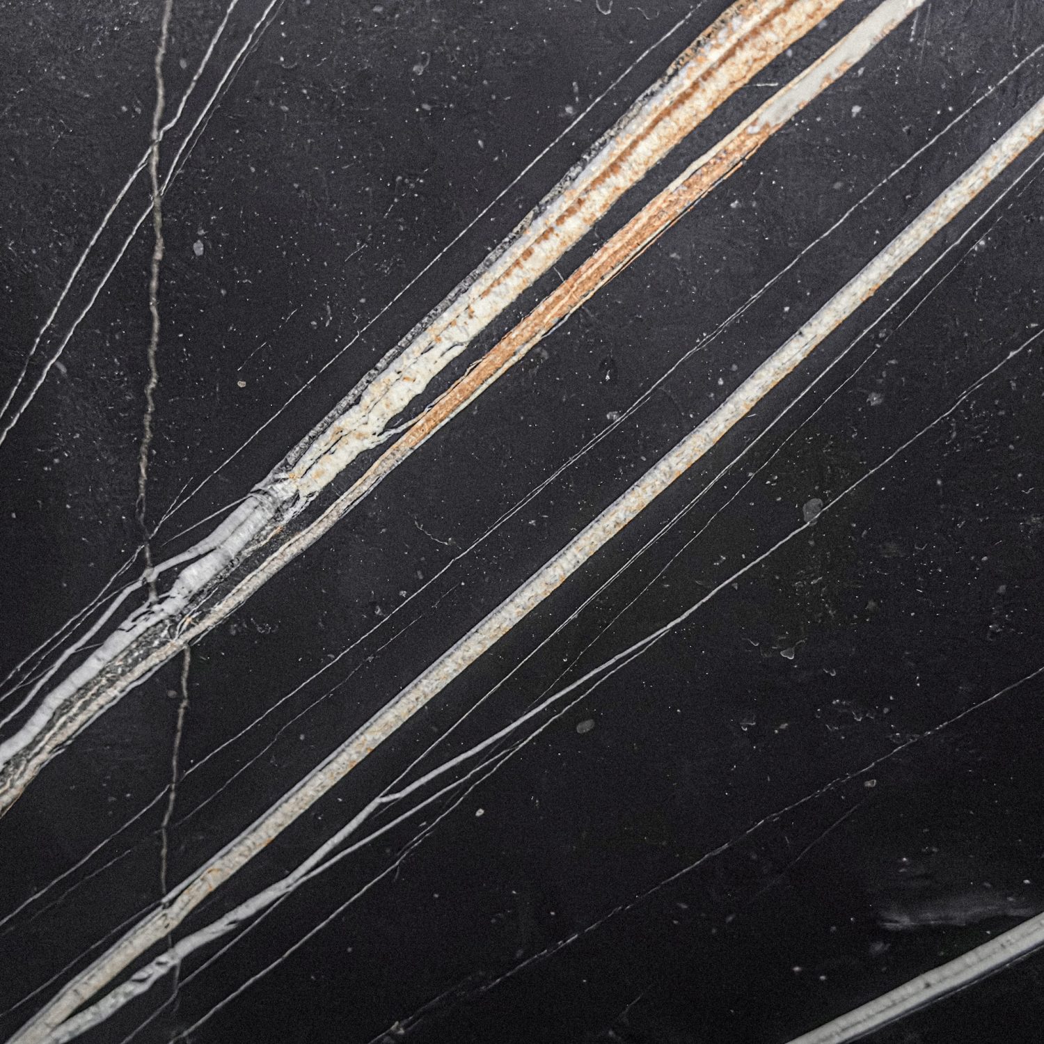 Sahara Noir captivates with its striking contrast between a deep black base and bold veins of white and orange that weave across its surface.