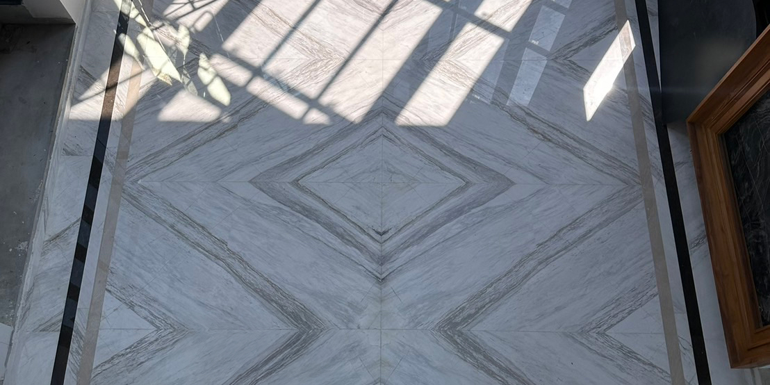 White Volakas features a white background adorned with elegant grey veining, occasionally complemented by delicate hints of ocean blue.