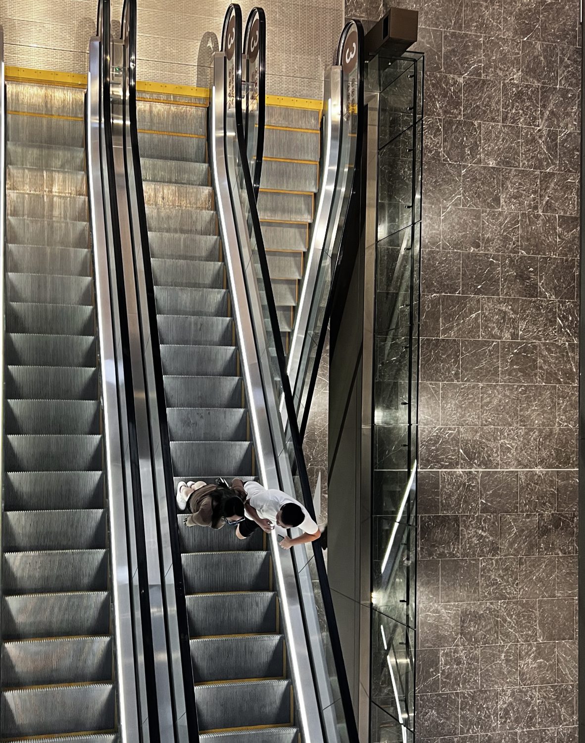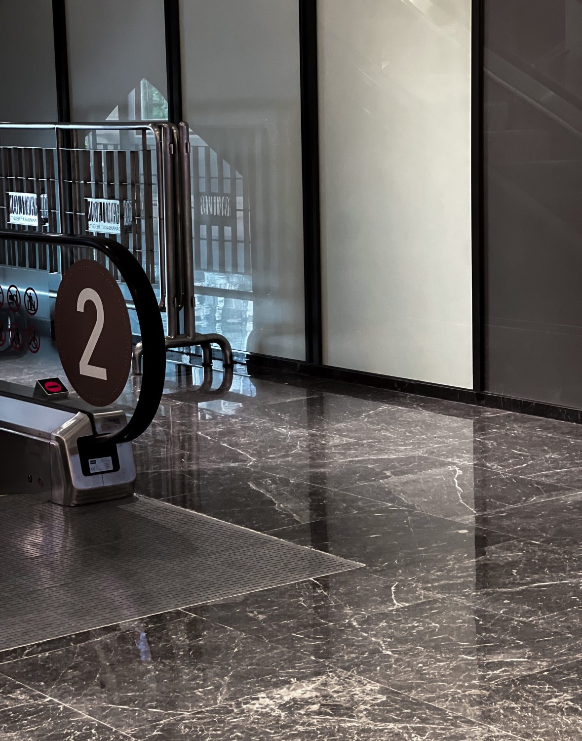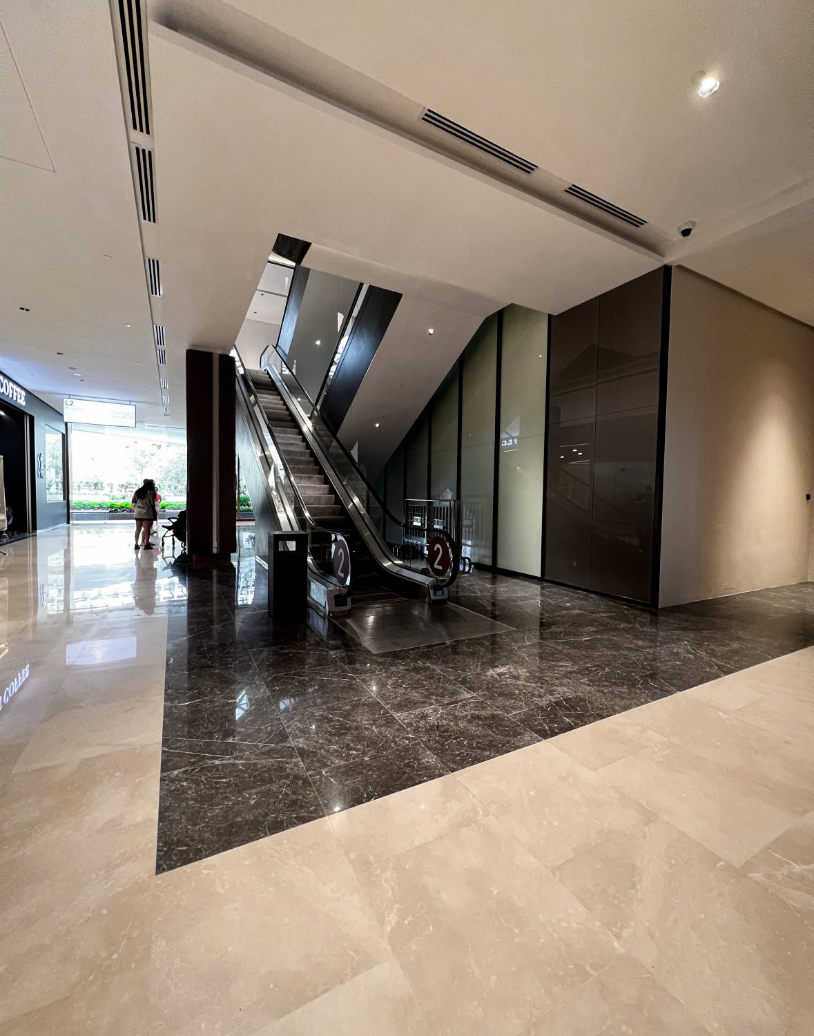 Shopping Mall Flooring in Crema Beige Marble & Olive Grey Marble Lift Flooring in Crema Beige Marble