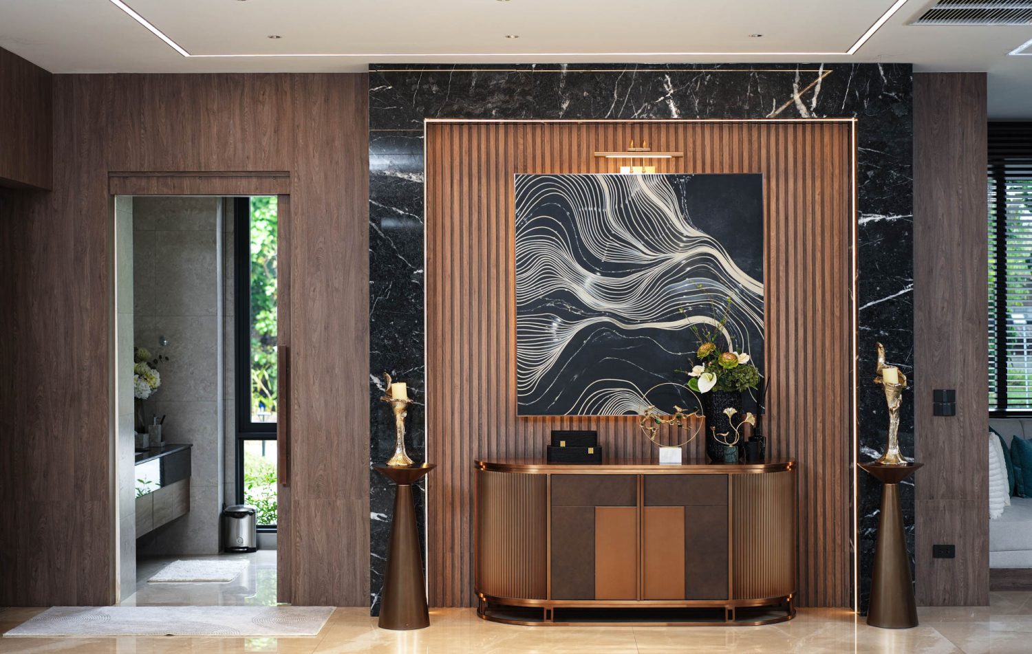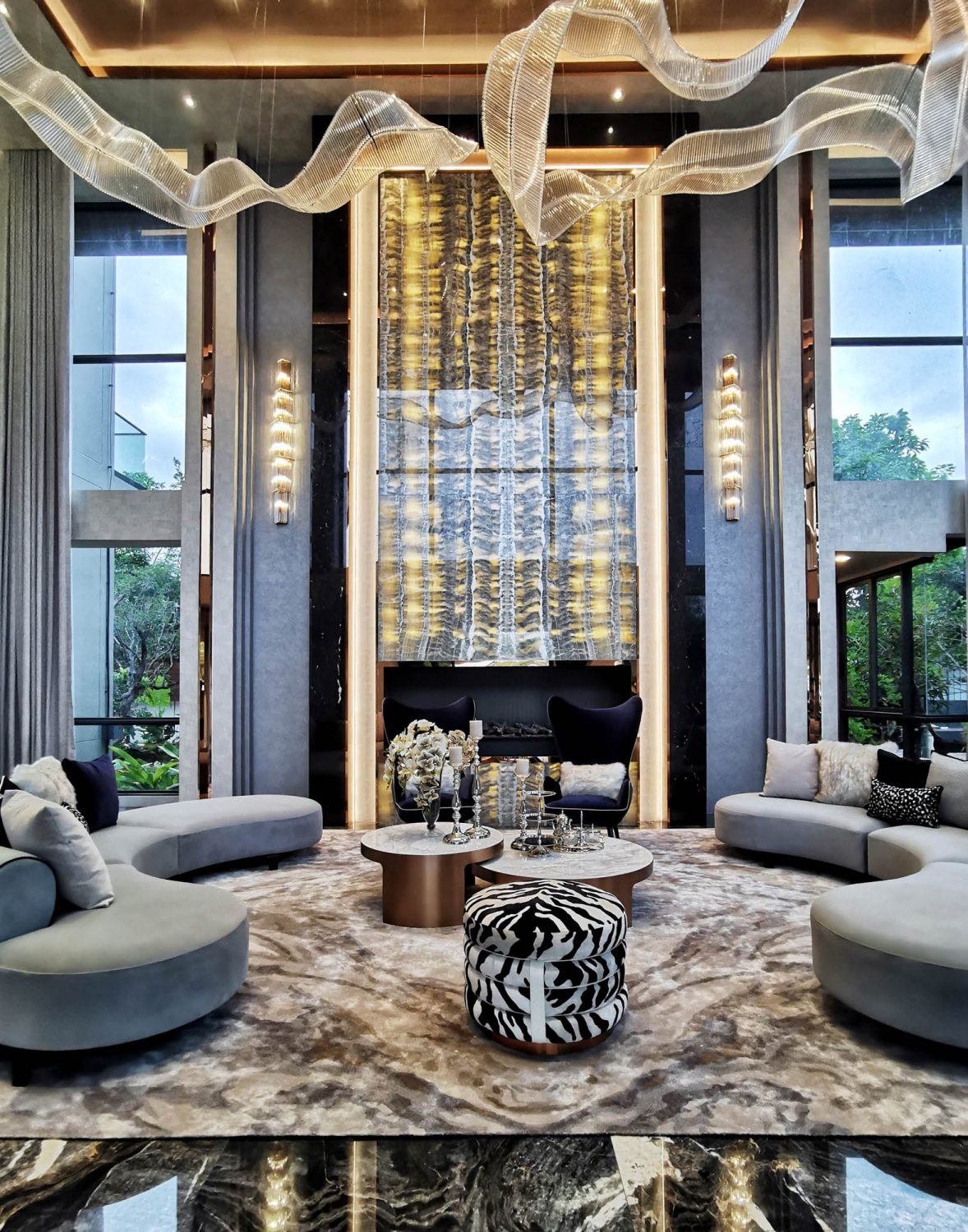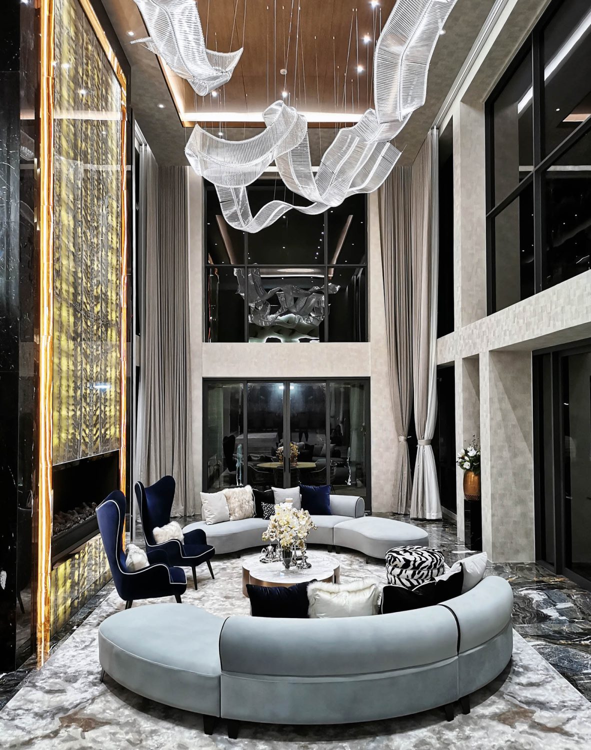 Living Room 2 Double Volume Feature Wall in Venetia Onyx, Bookmatched and framed with Nero Antique Marble
