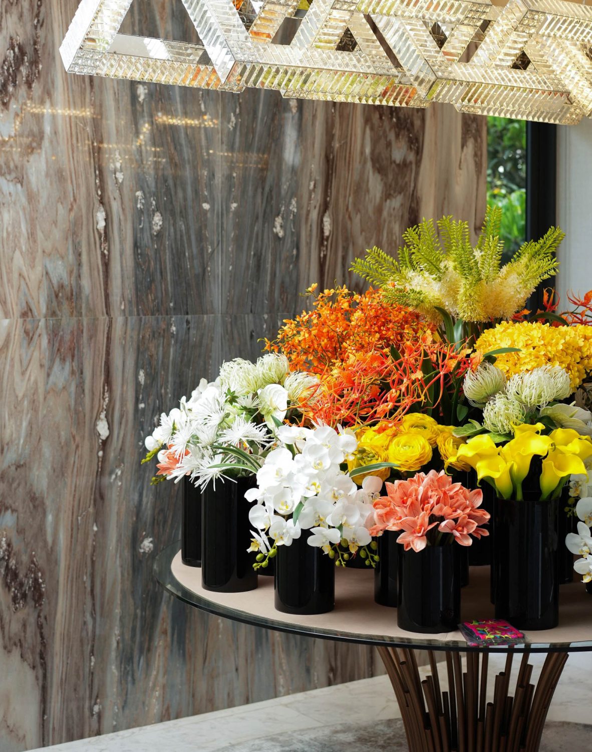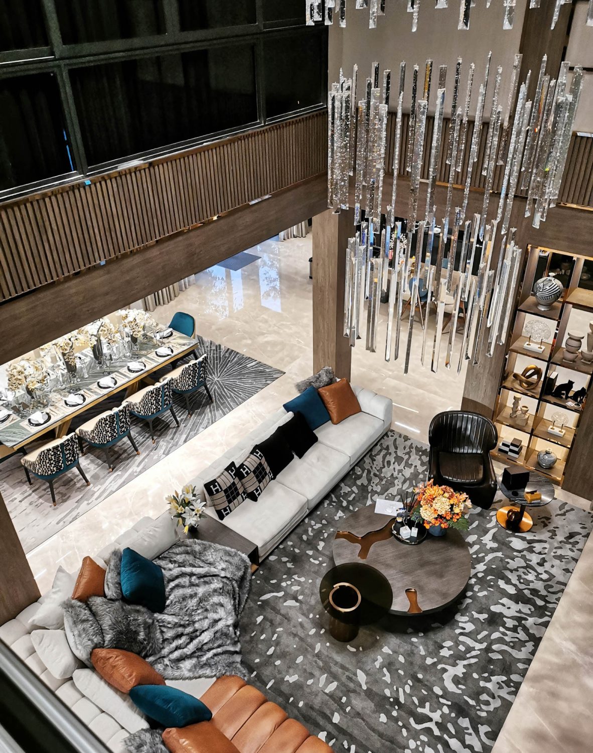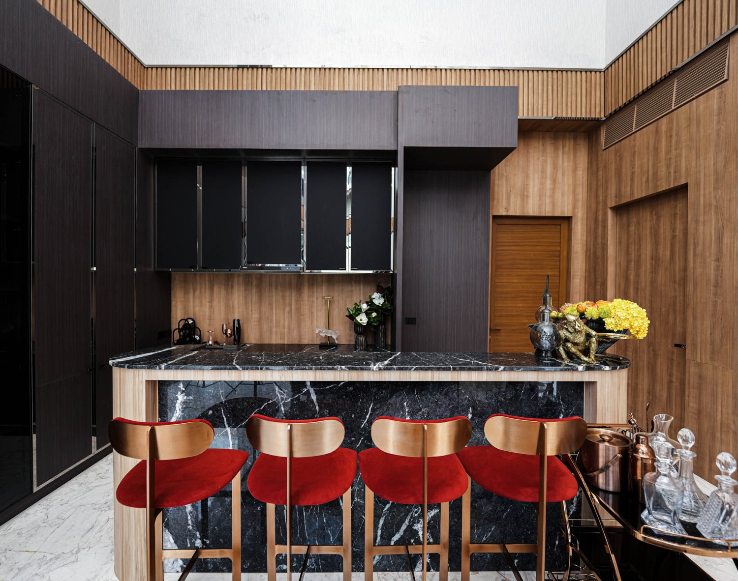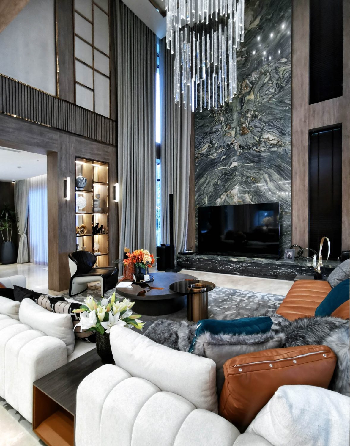 Living Room 2 Double Volume Feature Wall in Venetia Onyx, Bookmatched and framed with Nero Antique Marble