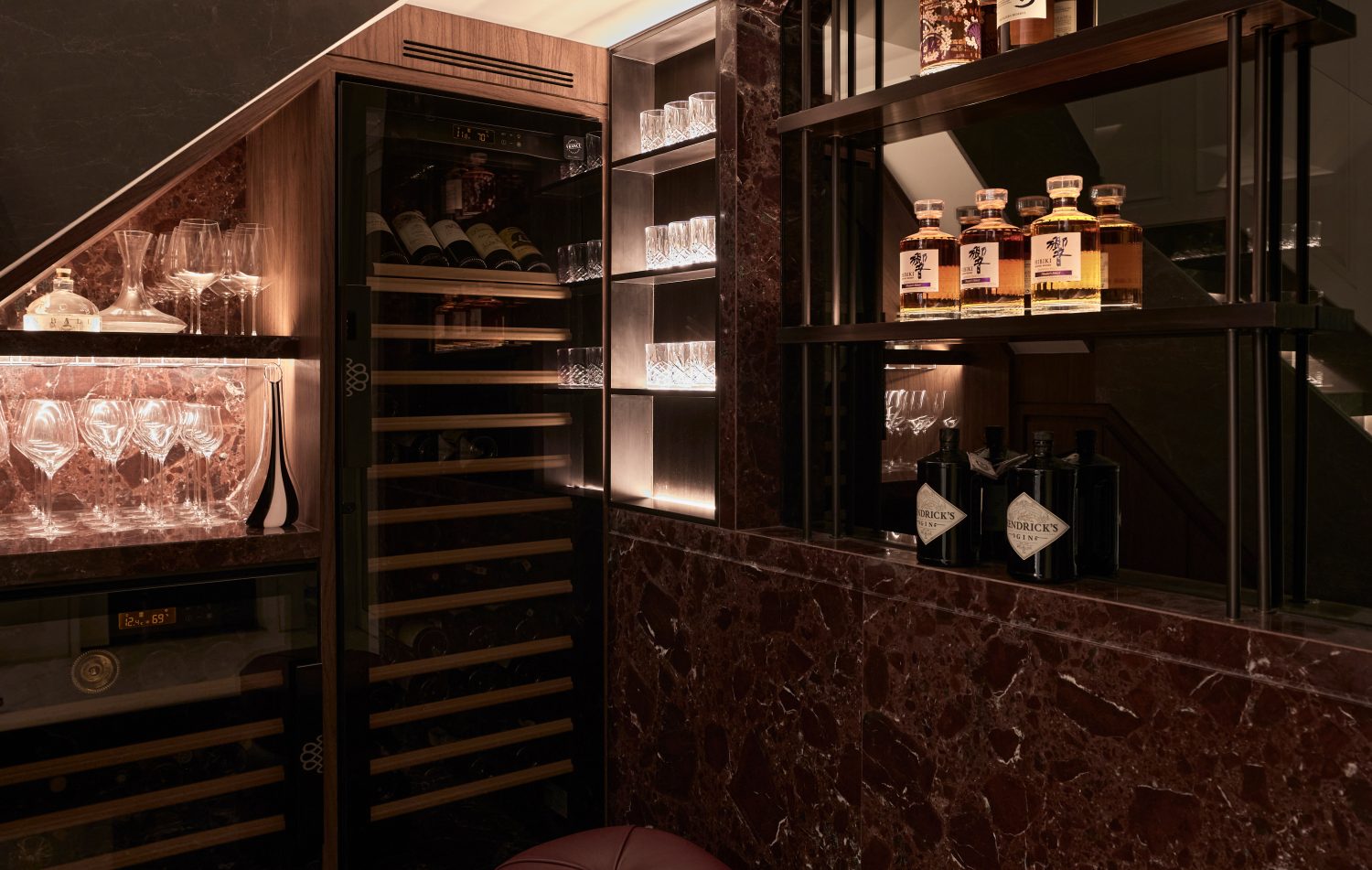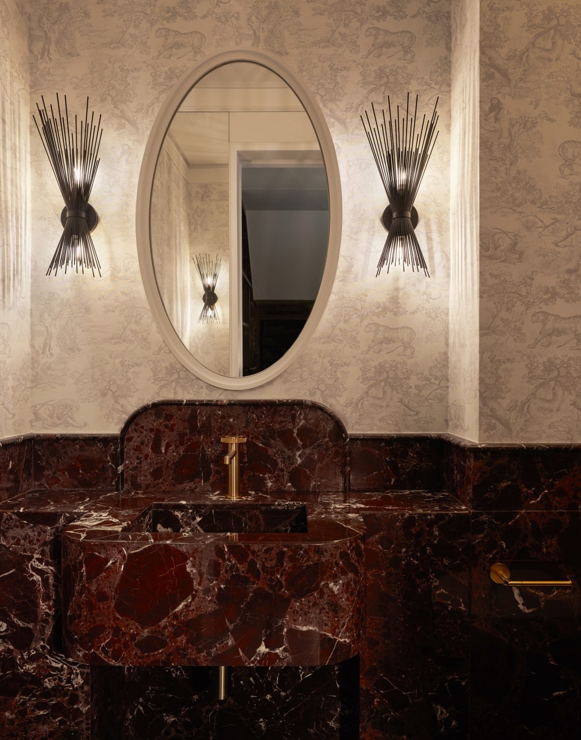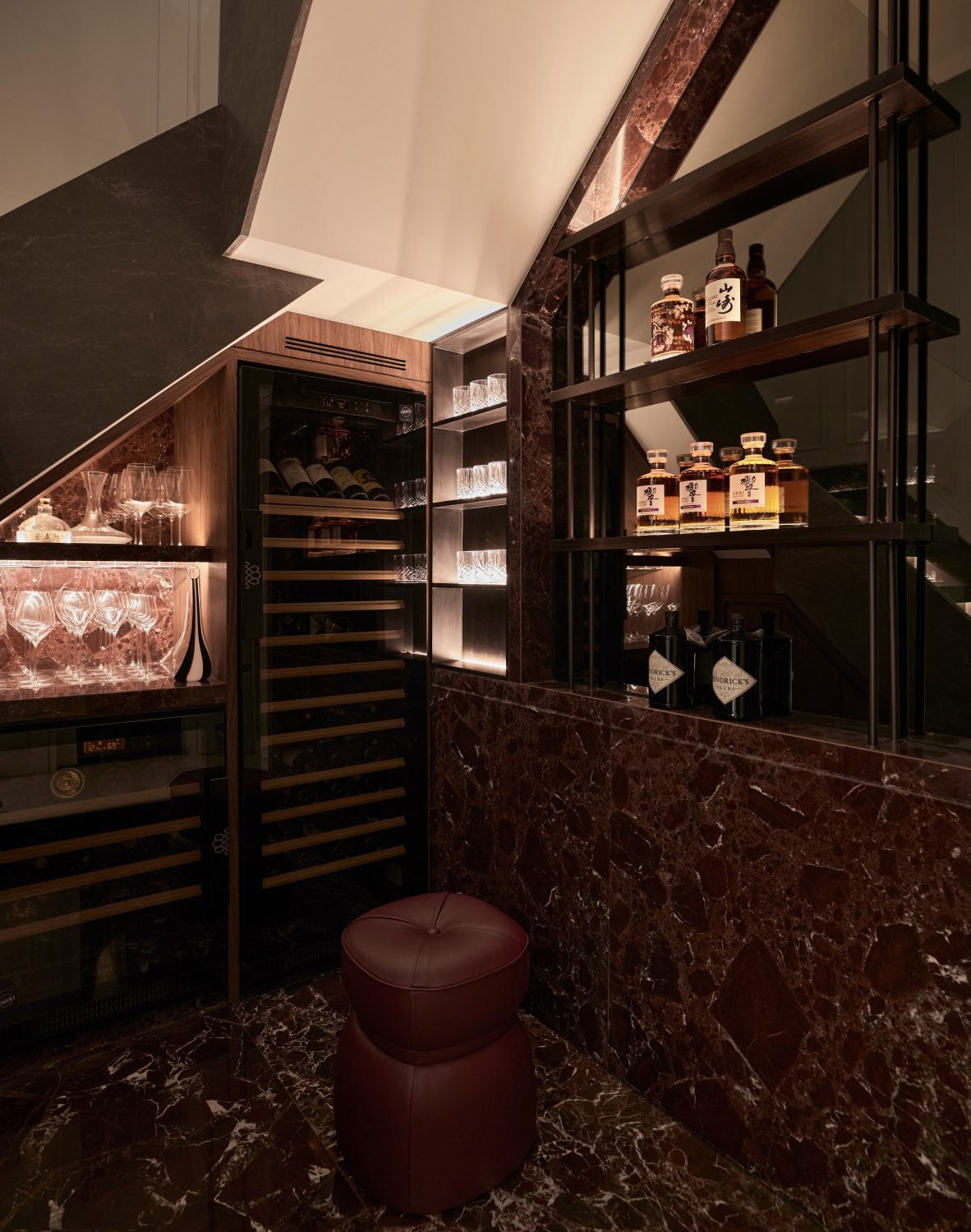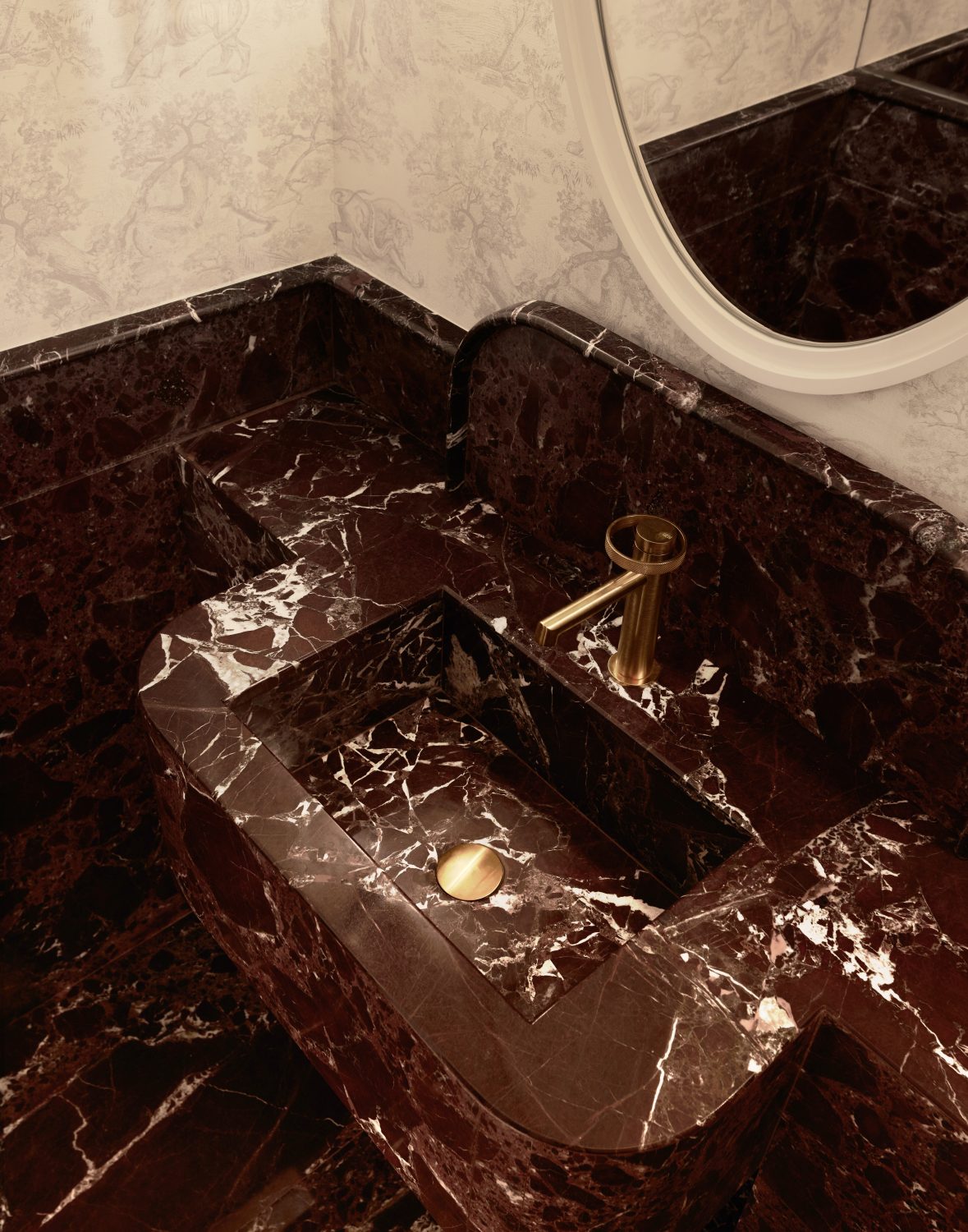 Rosso Lovanto marble was chosen to make a bold statement with its rich burgundy hues, creating a sense of understated glamour. The design draws inspiration from the Art Deco era, incorporating solid, striking elements for maximum visual impact. The powder room, anchored by a striking Rosso Lovanto vanity and Gessi Brassware, offers a timeless and luxurious focal point.